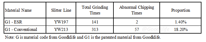 For a long time in the past, Goodklife has continuously tracked the performance of knives made from ESR raw materials by several customers. Table 1 is data from a large slitting center in Shanghai, China.
